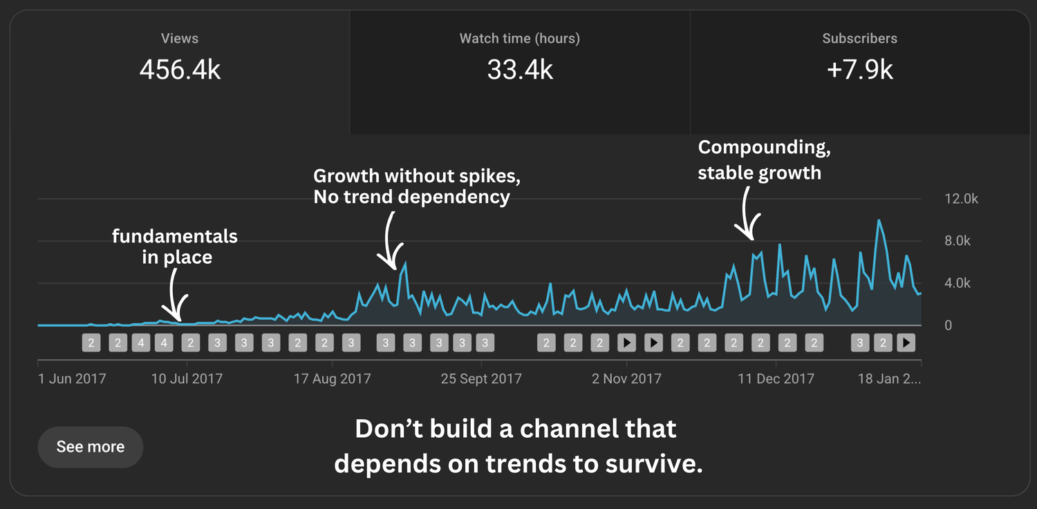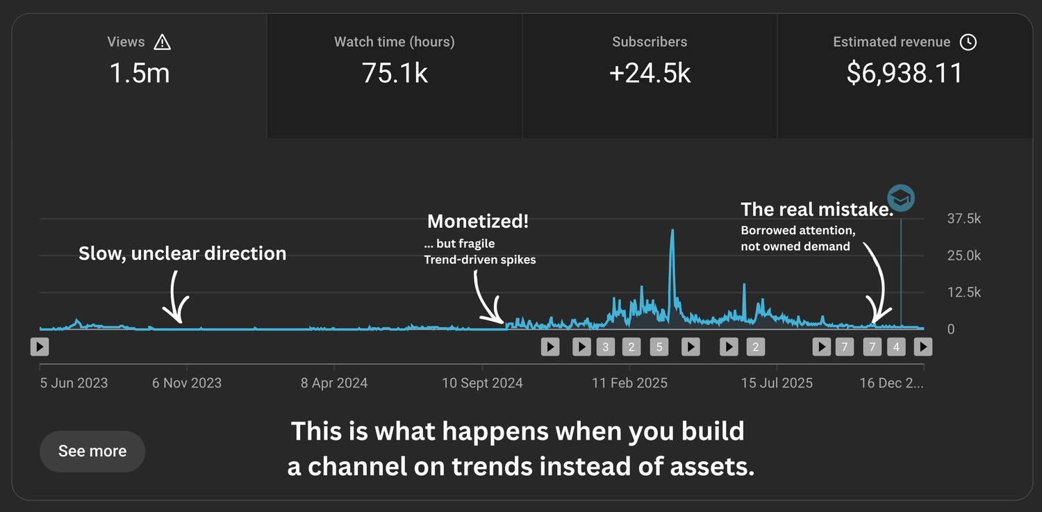 I learned this the hard way, by building a channel that grew on trends and collapsed months later.